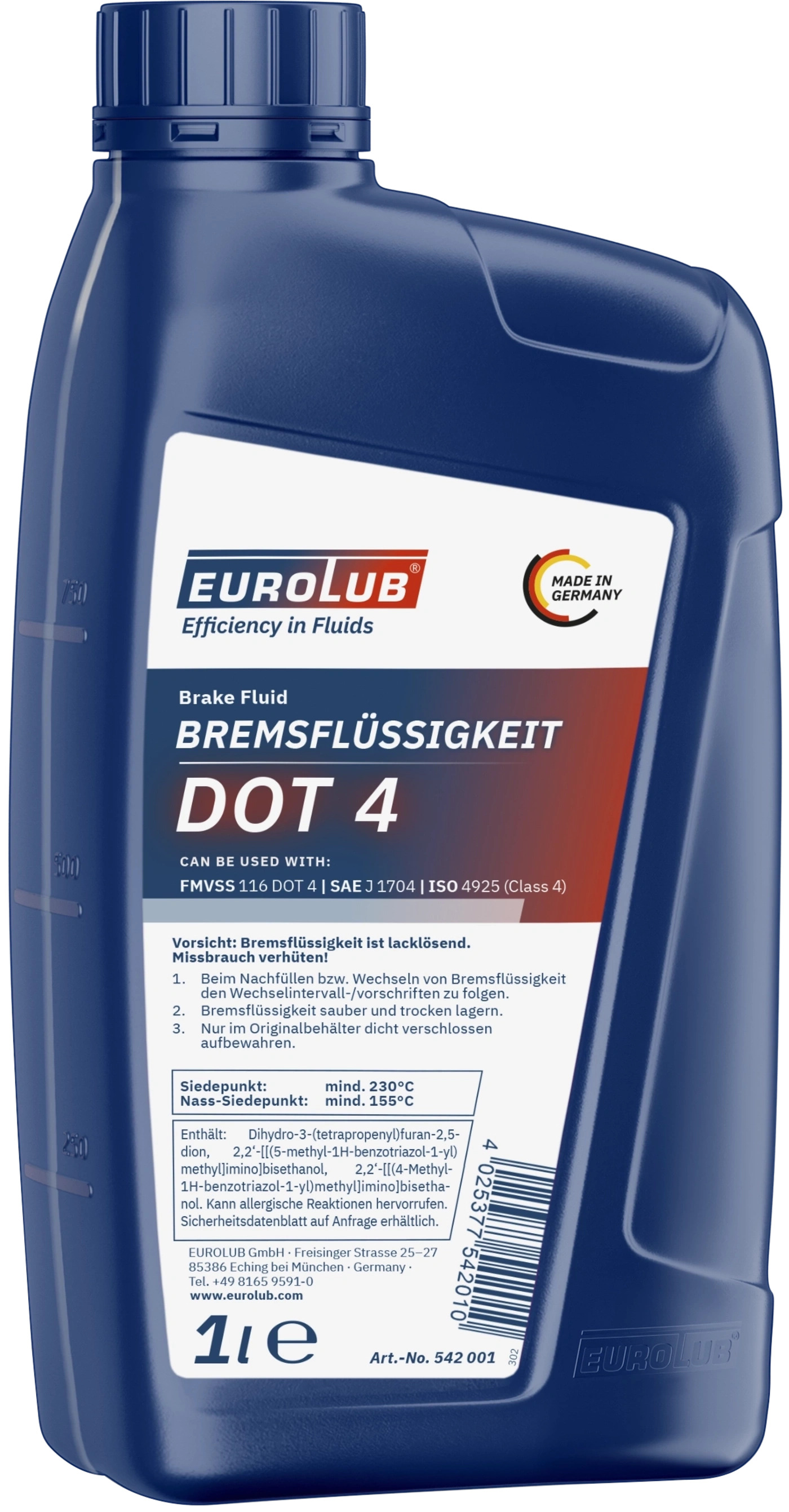 DOT4 ist auf Basis von Ether. Es enthält Glykole als Schmiermittel, wirksame Korrosionsinhibitoren und Antioxidationsmittel. DOT4 weist eine hohe thermische Stabilität auf. DOT4 zeichnet sich durch hervorragenden Korrosionsschutz gegenüber Eisen- und NE-Metallen aus. Einsatz, Anwendung und Intervalle nach den je nach Fahrzeug.